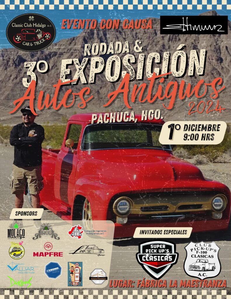 El próximo 1 de diciembre, se llevará a cabo un evento con causa lleno de historia, nostalgia y solidaridad, se trata de la “3er. Rodada y Exposición de autos Antiguos 2024”, la cual partirá de la carretera México-Pachuca y recorrerá las principales calles de la bella airosa, pasando por el Reloj Monumental hasta llegar a histórica fábrica de La Maestranza, donde se realizará la gran Exposición de Autos y Camionetas Clásicas 2024.