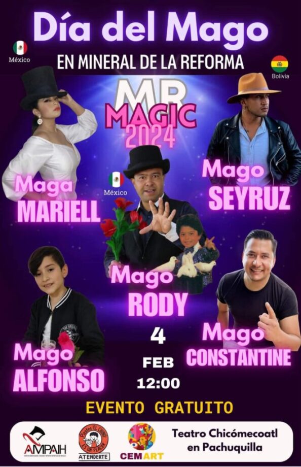 Este 4 de febrero, festeja la magia y emociónate con talentosos magos como el Magi Rudy (chiquilladas), el Mayo Roandy y muchos más. ¡Un excelente plan familiar! En Teatro Chicomecoatl, Pachuquilla.