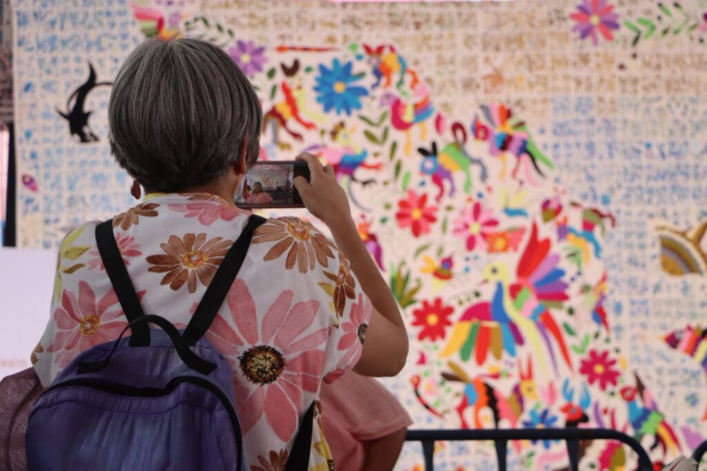 Este impresionante mural colectivo refleja el talento y la dedicación de las y los artesanos de Tenango de Doria, cuna de los famosos bordados conocidos como tenangos. Sus diseños, llenos de figuras de animales, plantas y escenas de la vida cotidiana, representan una expresión profunda de identidad cultural que ha trascendido fronteras.