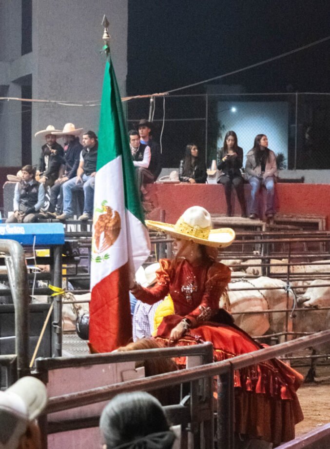 Posteriormente, se hace una breve ceremonia, en donde una charra desfila con la bandera mexicana y después se canta el himno nacional.