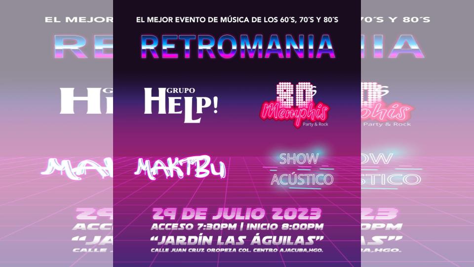 Si te gusta la onda retro y su música, agárrate porque se viene un increíble evento musical llamado Retromanía 2023. Será en el Jardín Las Águilas, de Ajacuba, el próximo 29 de julio a las 7 pm.