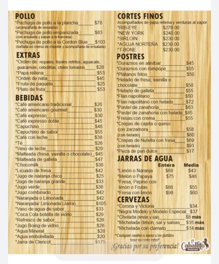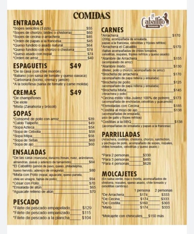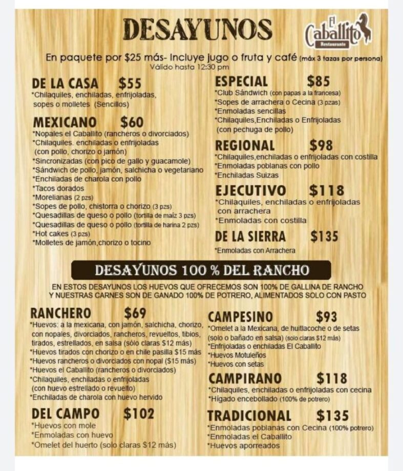 El Caballito es una opción entrañable para la familia, no sólo por su exquisito sabor y variedad, sino porque los ingredientes son de primera calidad: la carne es de pastoreo y está 100% libre de fármacos como clenbuterol. Sus salsas y moles son artesanales, el café lo traen de la sierra Huehuetla, el pan viene de Apan; todos sus productos son de negocios regionales, dejando fuera cadenas extranjeras. Entonces puedes estar seguro de que consumes alimentos 100% hidalguenses.