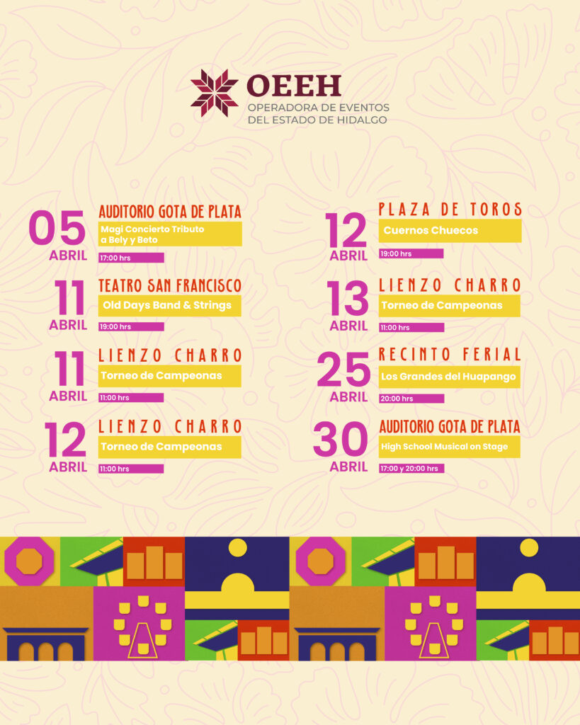 Este mes de abril, los recintos que administra la Operadora de Eventos de Hidalgo (OEEH), ofrecen una cartelera de entretenimiento con amplia variedad de espectáculos para todos los gustos, las actividades inician el 5 de abril en el Auditorio Gota de Plata con Magi Concierto, un show pensado para los más pequeños del hogar, donde podrán disfrutar de sus personajes favoritos como el tributo a Bely y Beto, en un ambiente lleno de música, alegría y diversión familiar.