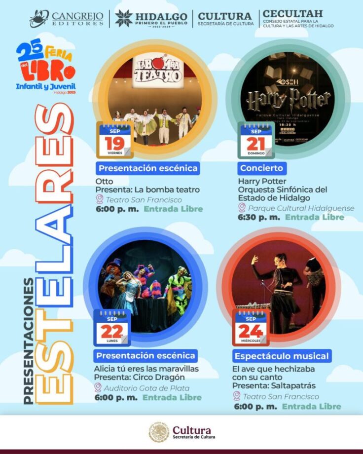 La Feria del Libro Infantil y Juvenil Hidalgo 2025 no solo celebra la literatura, también ofrece al público una cartelera llena de arte escénico, música y fantasía que hará vibrar a chicos y grandes en el corazón de Pachuca.