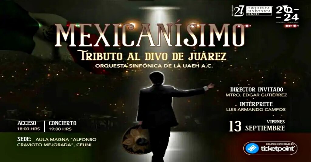 La Orquesta Sinfónica de la Universidad Autónoma del Estado de Hidalgo A. C., te invita a esa disfrutar de una velada espectacular «Mexicanísimo, tributo al Divo de Juárez».