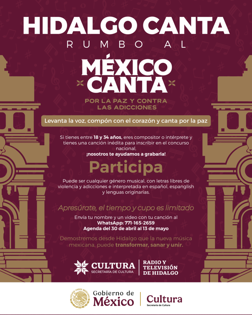 Con el objetivo de abrir oportunidades profesionales en la industria musical, el Gobierno de México, a través de la Secretaría de Cultura federal, y con el respaldo de la Secretaría de Cultura del estado de Hidalgo, lanzó el concurso binacional “México Canta”, en alianza con el Consejo Mexicano de la Música.