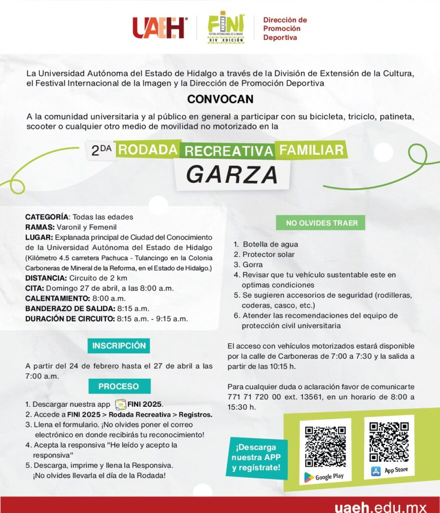 Mineral de la Reforma, Hidalgo. – A todas las personas que disfrutan del deporte y la actividad física, ha llegado el momento de que alisten sus patines y patinetas, revisen sus bicicletas y se pongan los tenis para participar el próximo domingo 27 de abril en la Segunda Rodada Recreativa Familiar Garza, impulsada por la Universidad Autónoma del Estado de Hidalgo (UAEH) como parte de las actividades de la 14 edición del Festival Internacional de la Imagen (FINI) 2025, que se llevará a cabo del 24 de abril al 02 de mayo del presente año.
