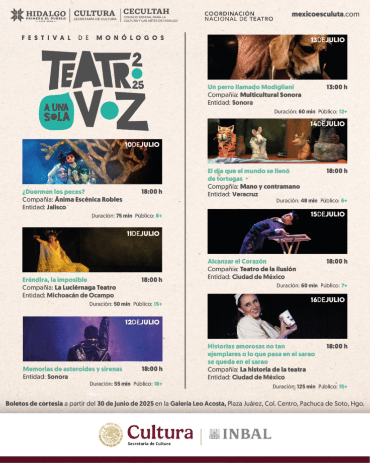 Por primera vez, el estado de Hidalgo se integra al prestigioso Festival de Monólogos “Teatro a Una Sola Voz”, uno de los circuitos escénicos más representativos del país, en su edición número 20.