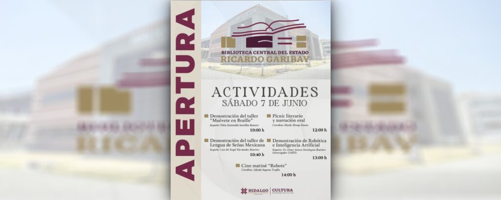 La Biblioteca Central del Estado de Hidalgo Ricardo Garibay reabre sus puertas este sábado 7 de junio, luego de una pausa por los trabajos del Parque Cultural Hidalguense. Durante la jornada de reapertura, niñas, niños, jóvenes y personas adultas podrán disfrutar de un programa especial que combina arte, ciencia y cultura.