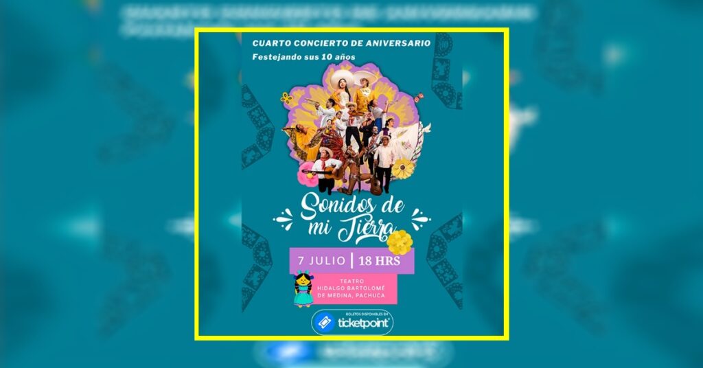 Este viernes 7 de julio a las 6 PM, llega al Teatro Hidalgo «Bartolomé de Medina», el espectáculo de Música Mexicana «Sonidos de mi Tierra» con 16 artistas en escena entre músicos, bailarines y cantantes haciendo un recorrido por diferentes épocas y regiones del país mostrando su música, bailes, trajes típicos, costumbres, tradiciones y leyendas.