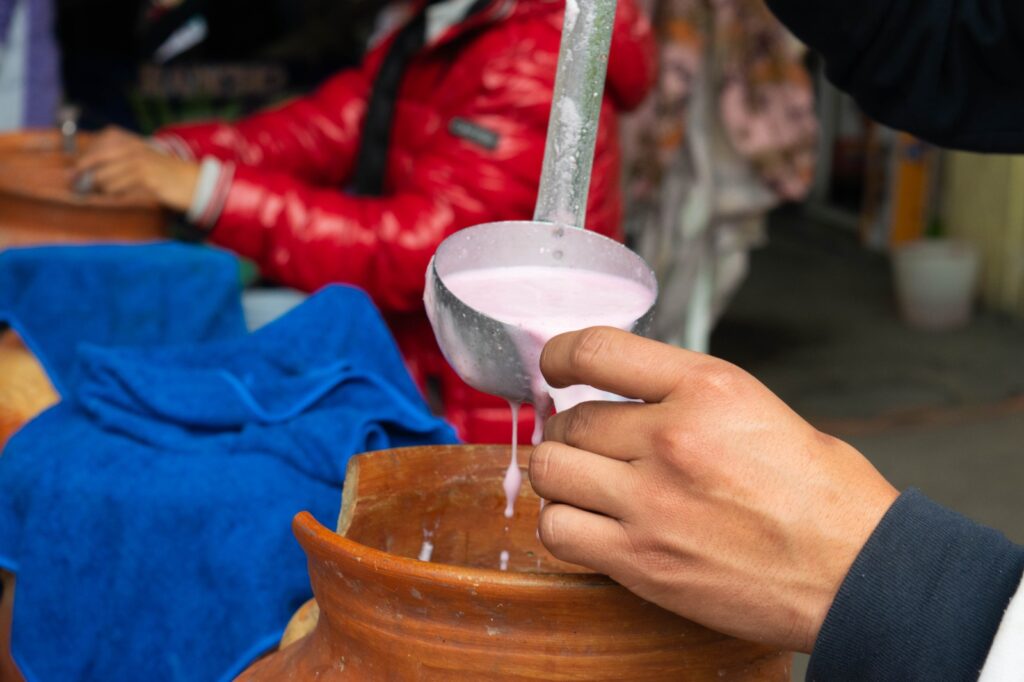 Por otro lado, nos encontramos con deliciosas bebidas como los curados de pulque: de queso con zarzamora, yerbabuena, frutos rojos, mazapán, mamey, etc.
