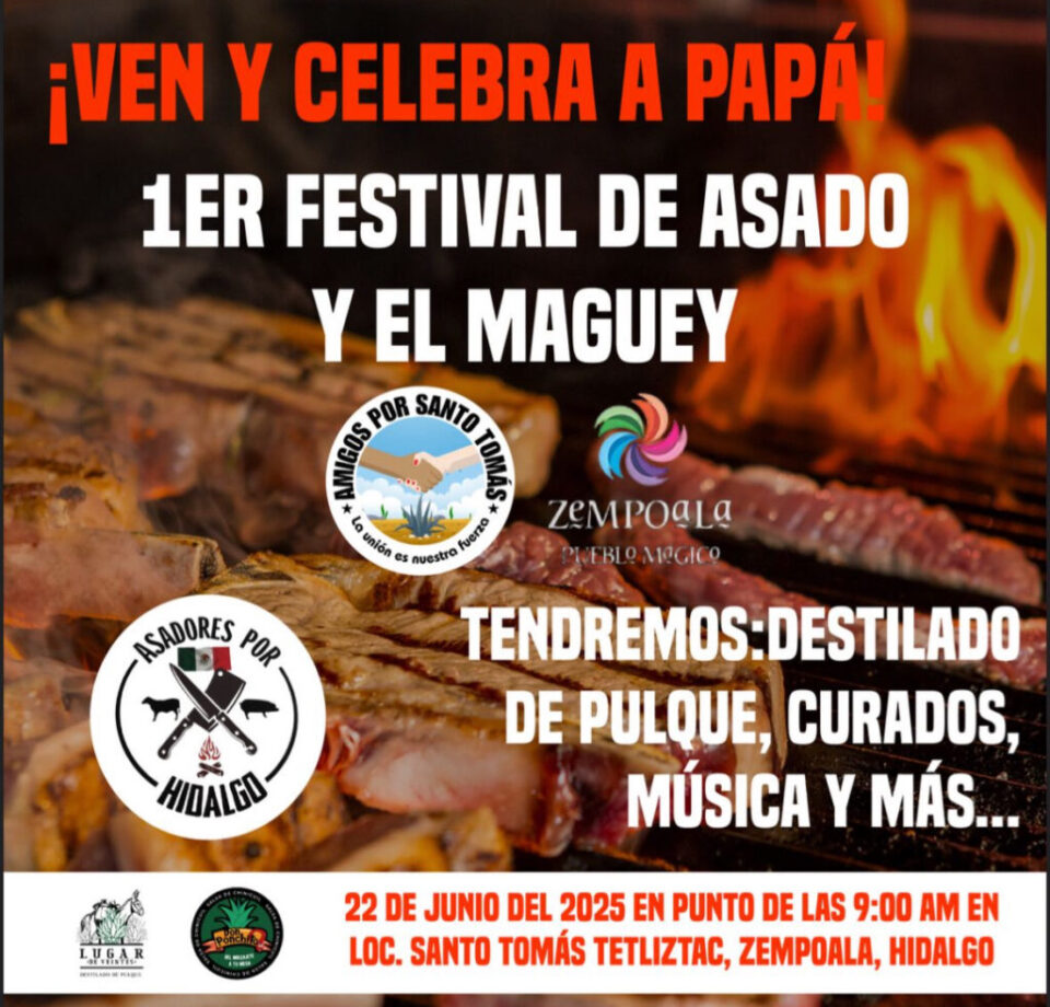 Como muestra de esta identidad culinaria y en homenaje a uno de sus emblemas naturales, el maguey, se llevará a cabo el 1er Festival del Asado y el Maguey el próximo 22 de junio a partir de las 9:00 de la mañana, en el municipio de Zempoala, dentro de las instalaciones del mercado de la comunidad de Santo Tomás, justo a un costado del kiosco principal.